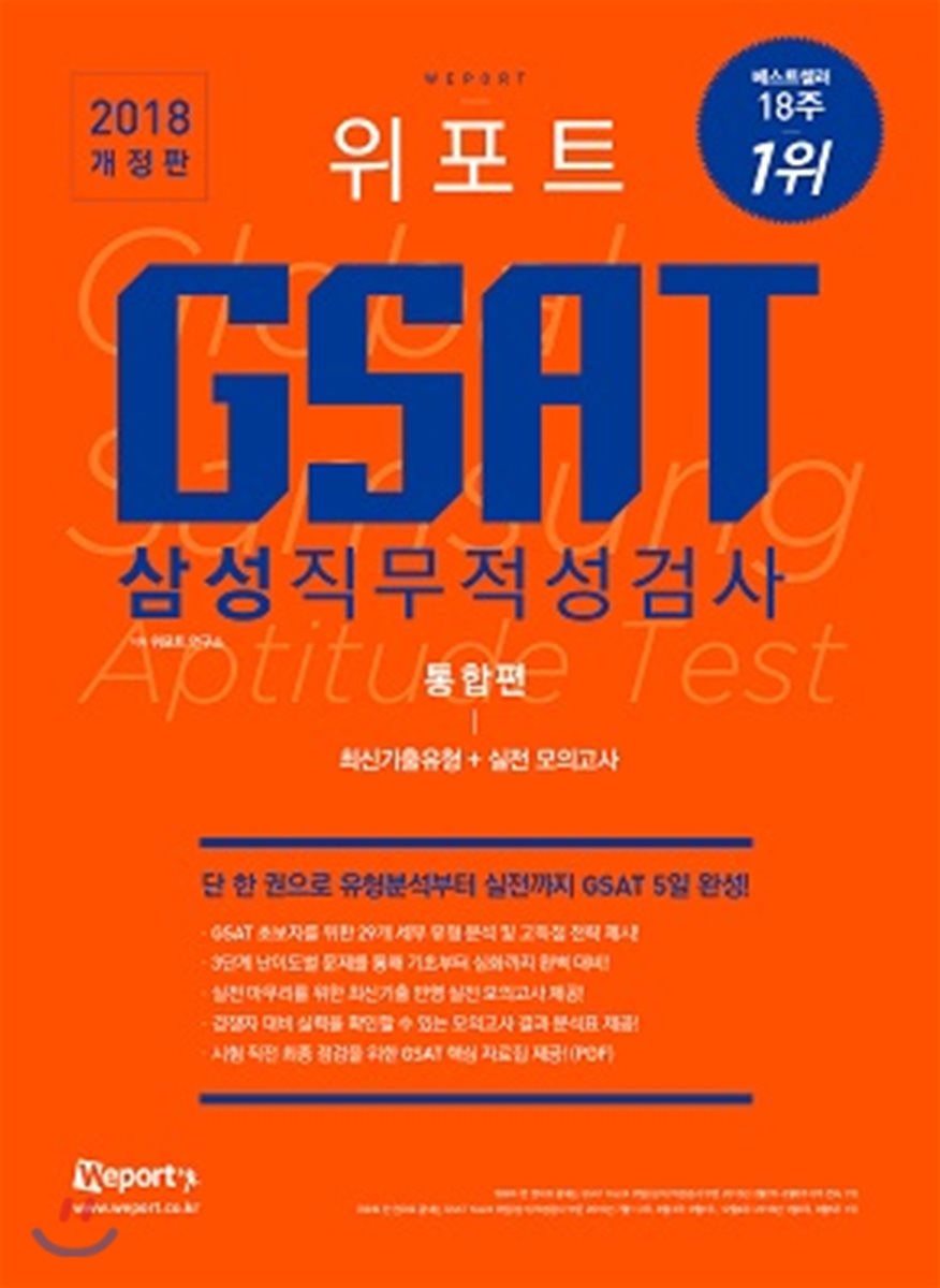 - 2018 위포트 GSAT 삼성직무적성검사 통합편 최신기출유형분석+실전 모의고사 책 강의 들으려고 샀는데 구성부터 강의까지 너무 좋아요 강추합니다 빨리 보고 취뽀하고싶어요 수리가 특히 약한데 이 책을 통해서 수리영역 마스터 하고 싶네요 2018 위포트 GSAT 삼성직무적성검사 통합편 최신기출유형분석+실전 모의고사 강추합니다!
